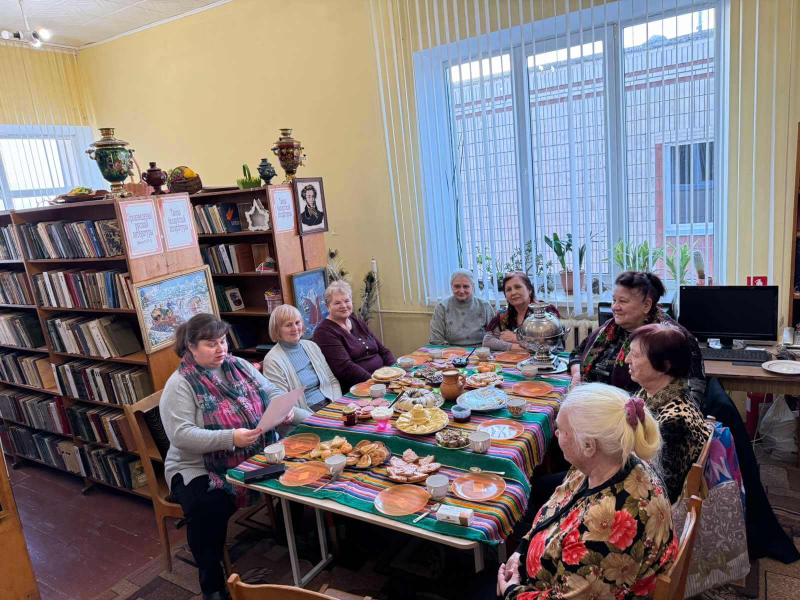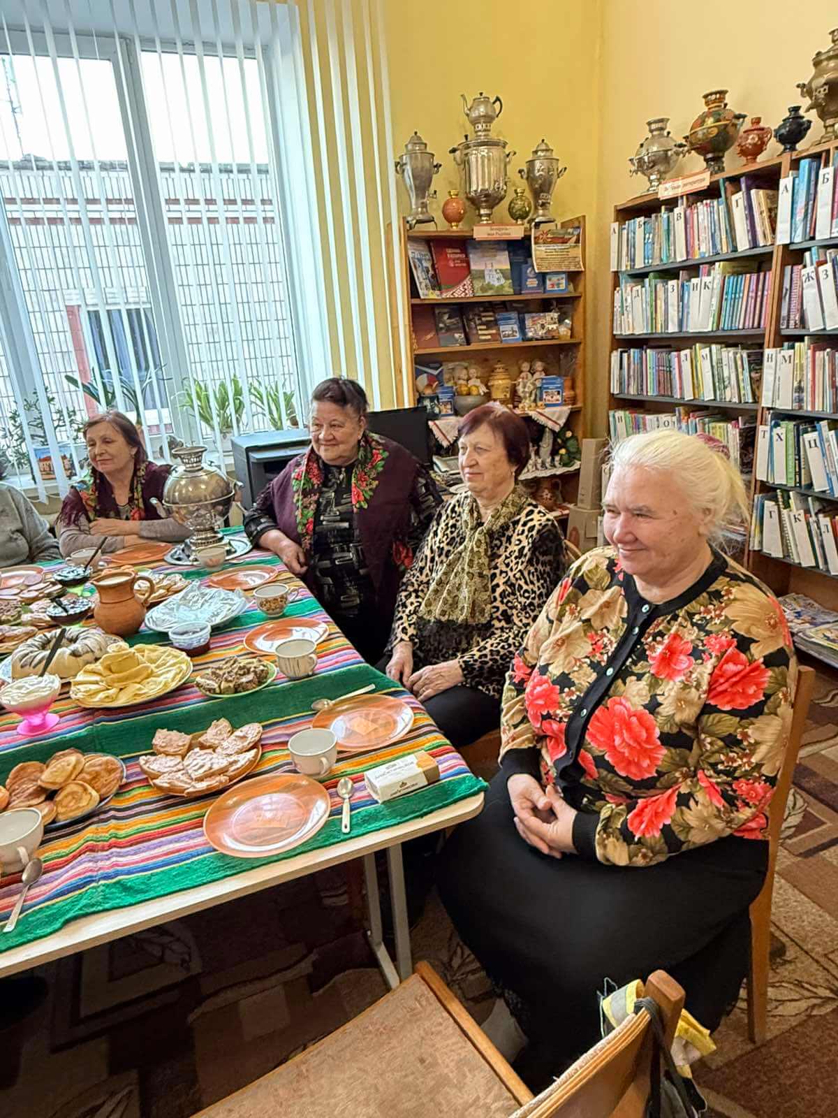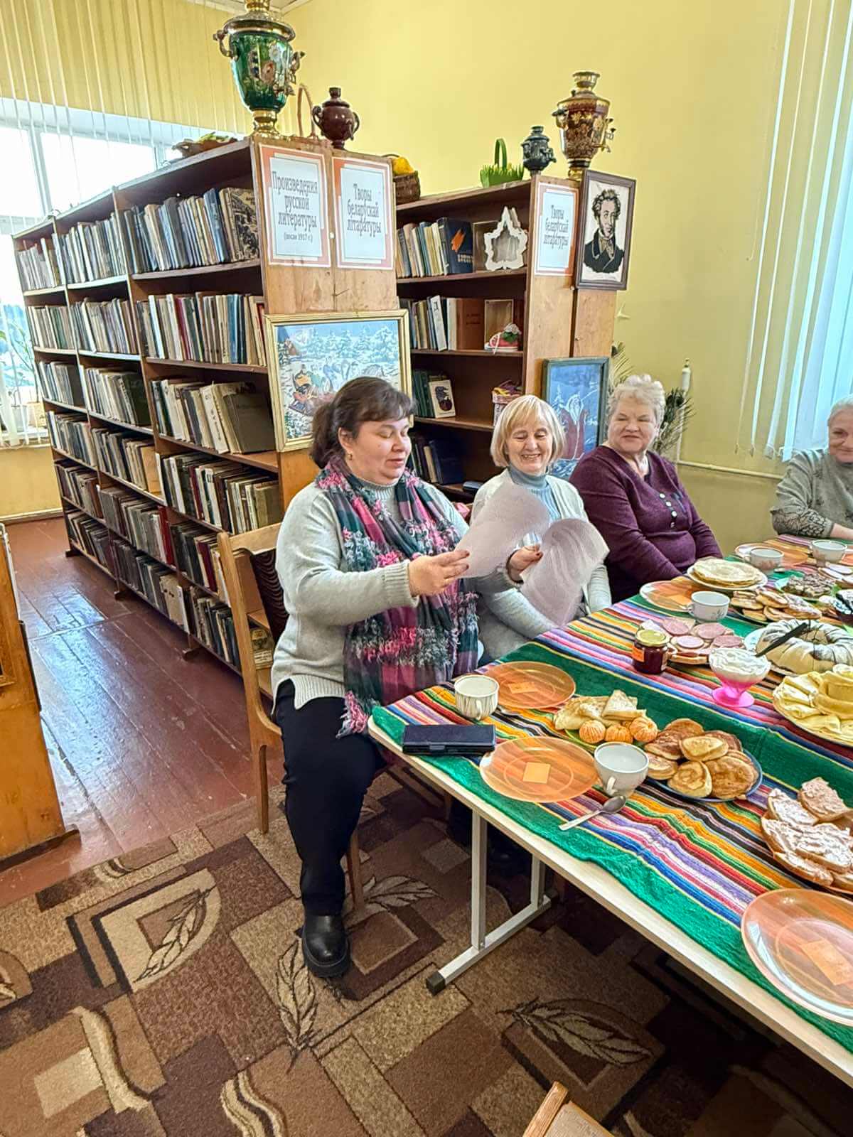 Участницы мероприятия напекли и нажарили разнообразных блинов со сладким и другими разными начинками. Библиотекарь познакомила с историей масленичной недели, рассказала как называется каждый день недели, традиции праздника и запреты в эту неделю. Пили ароматный травяной чай из самовара с блинами и пели песни.